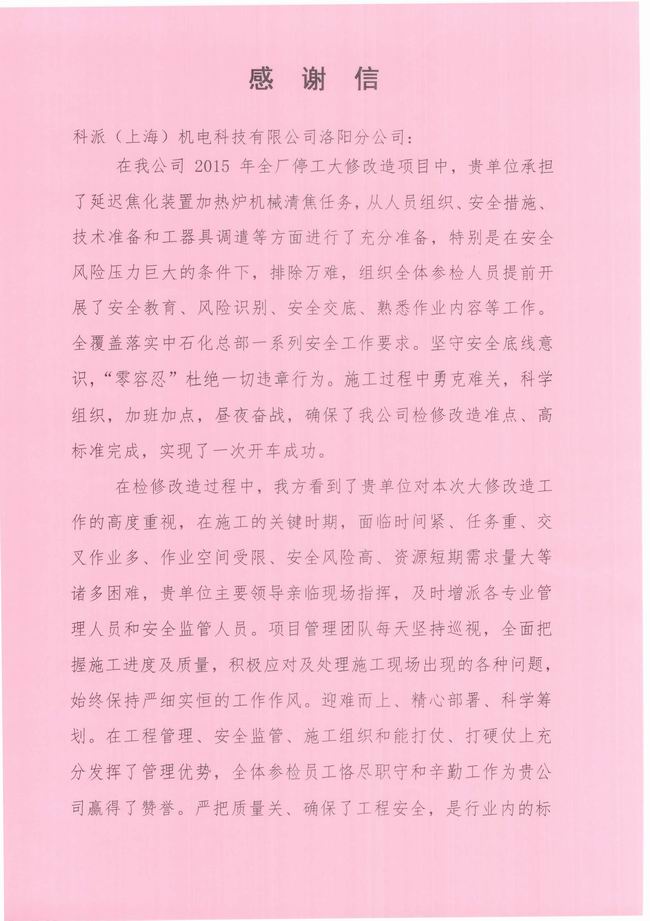 Thank you letter from Sinopec Qingdao Refining & Chemical Company